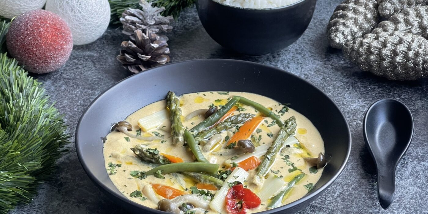Combina la cremosidad de la leche de coco con el toque especiado de la pasta de curry, el frescor cítrico de la lima kéfir, el lemon grass y una mezcla vibrante de verduras como bambú, shimeji, espárragos verdes y judías verdes.
